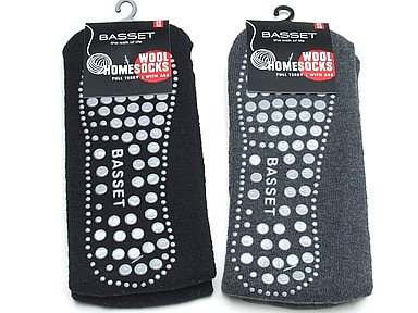 Korte wollen antislip sokken voor dames die ideaal zijn voor als u last heeft van knellende boorden. Verkrijgbaar in zwart, antraciet, en marine. Met badstof zool.